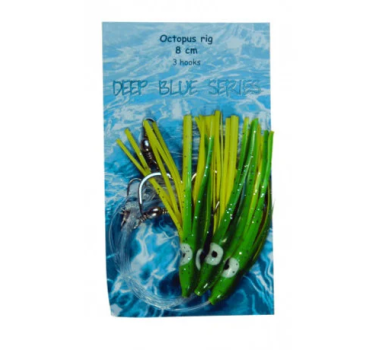 De Albatros Deep Blue Octopus Rig is een krachtige en betrouwbare zee-onderlijn, speciaal ontwikkeld voor het vissen op grote en sterke zeevissen. Deze complete rig is voorzien van drie octopus-imitaties van 8 cm, die zorgen voor extra attractie en beweging onder water.